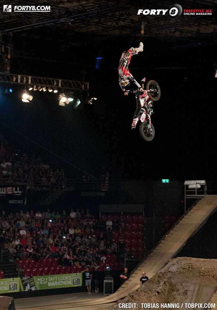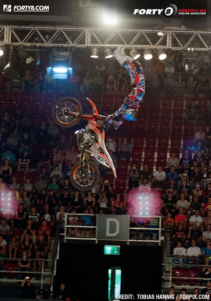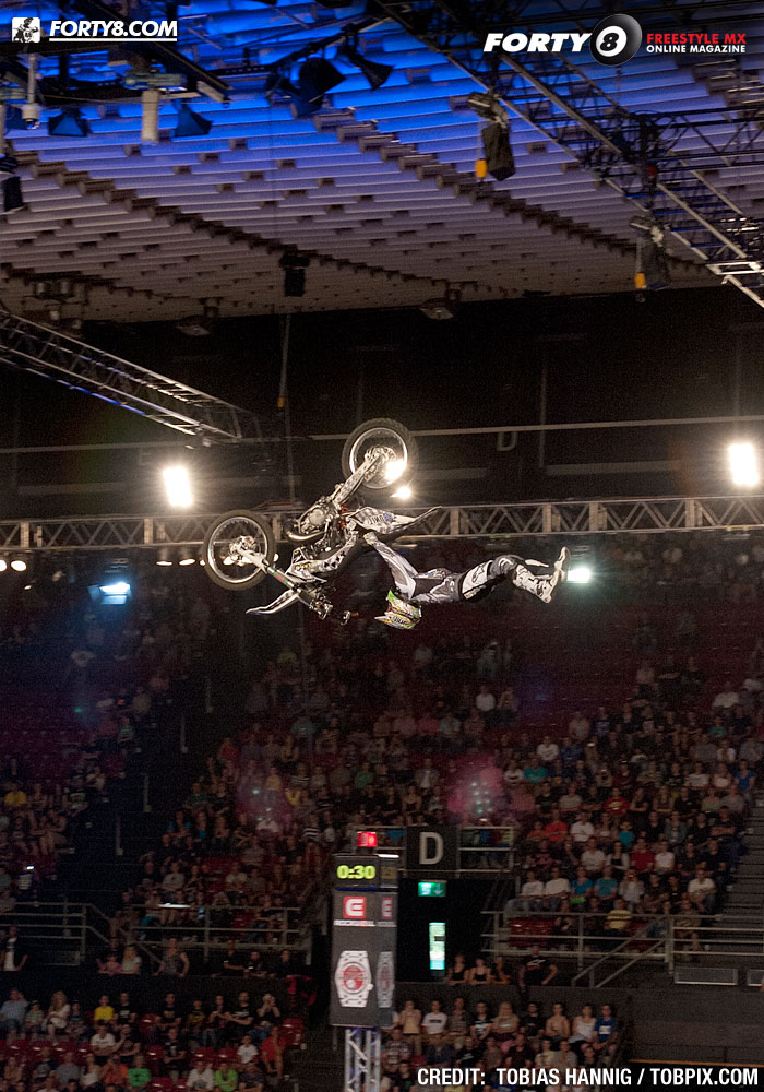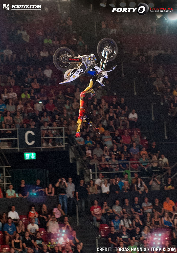 Basel, 21 June 2013: After the freak weather in Europe on Thursday, another storm blew into Basel the following day with the arrival of the world’s Top Ten freestyle motocross riders in the Sankt Jakobshalle, all of them intent on scoring points towards the FIM Freestyle MX World Championship. This is the seventh occasion on which NIGHT of the JUMPs has been staged in the Basel arena, and with the championship campaign having reached an absolutely critical stage, the tension was running exceptionally high.