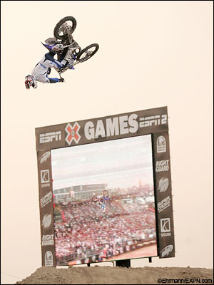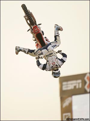 Travis Pastrana (Annapolis, Md.) pulled of the Saran Wrap Backlflip to no-handed lander and earned second place with a score of 91.20. On his first run he attempted the first-ever Backflip to Barspin and the specially-engineered front wheel fell off on the landing, leaving Pastrana in dead last.